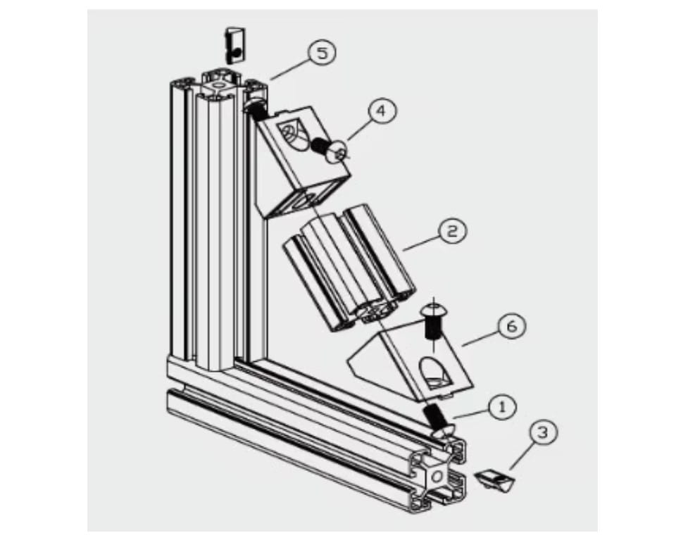 ✔️ W przypadku montażu narożnika do profili (zdj. obok) należy użyć śruby M6 mm lub śruby młoteczkowej M6 albo wpustów rowkowych M6.