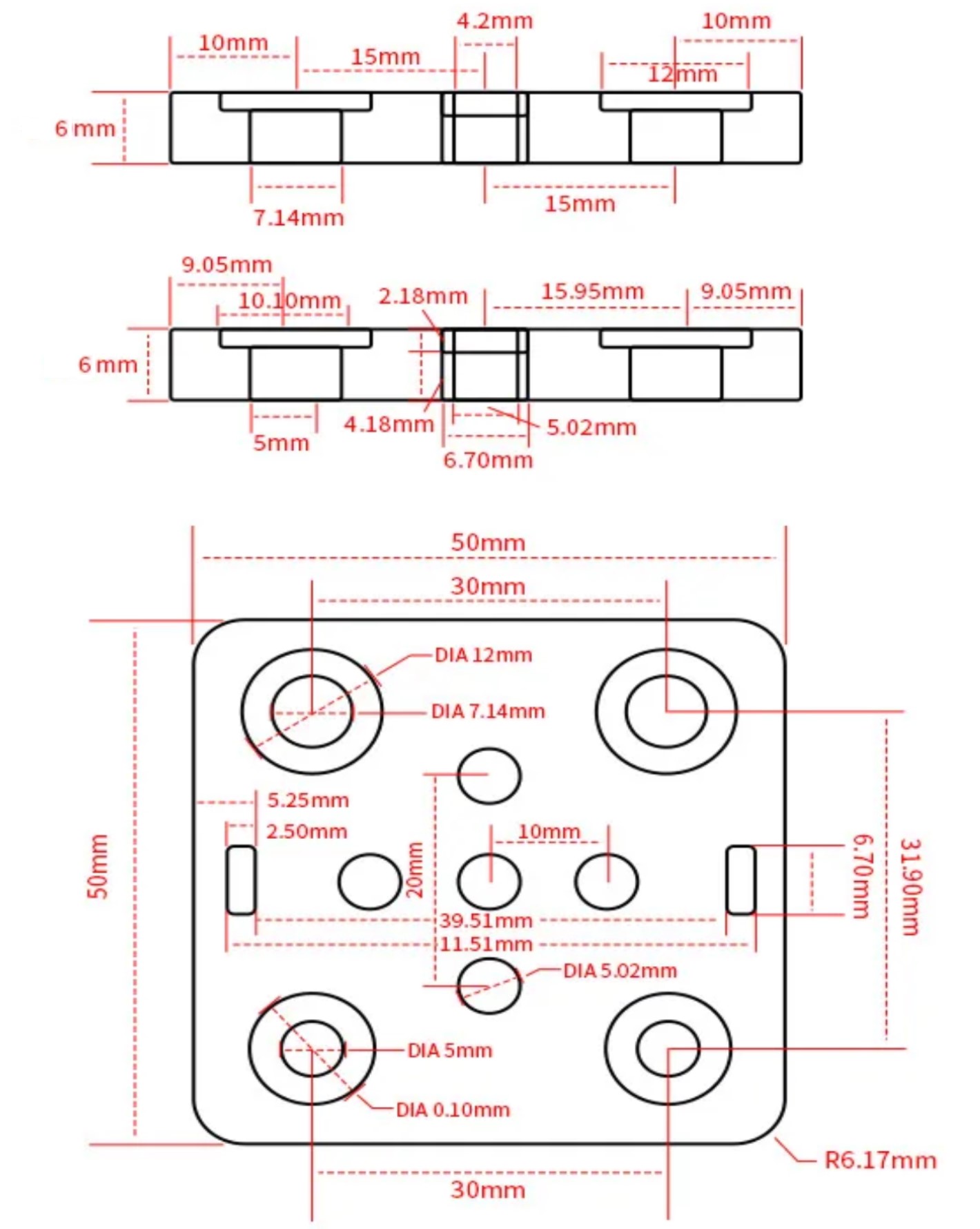 ✔️ Płytka posiada również dwa otwory ze specjalnym przeznaczeniem na mocowanie paska zębatego 6 mm.